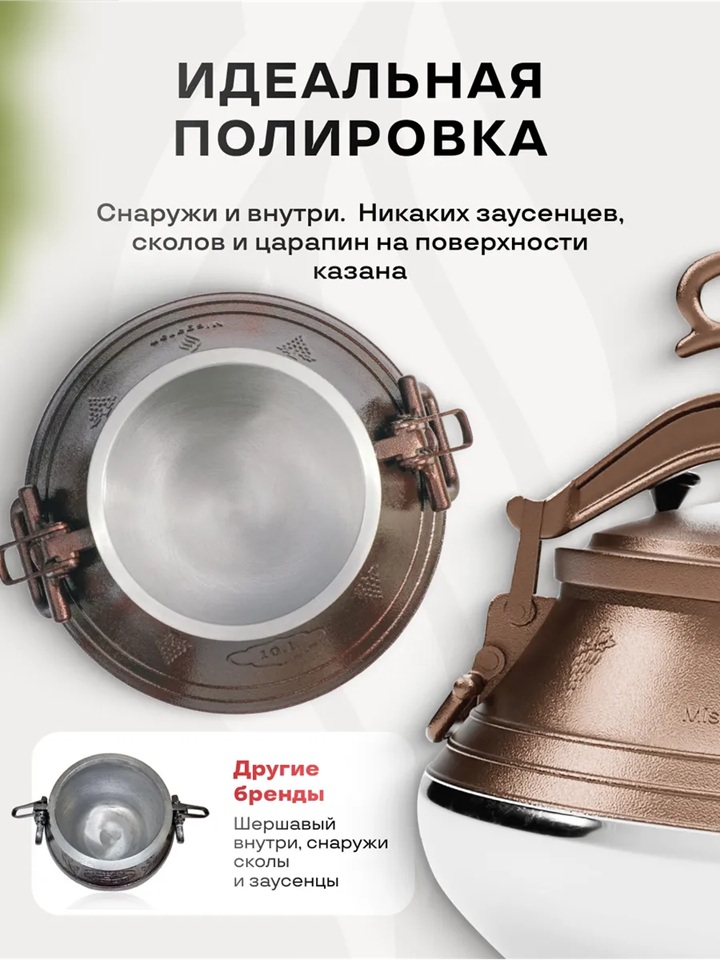 • Надежность на десятилетия. Изготовлен из литого алюминия с увеличенной толщиной стенок. Такой казан не боится деформаций, открытого пламени и прослужит верой и правдой долгие годы, становясь фамильной вещью.